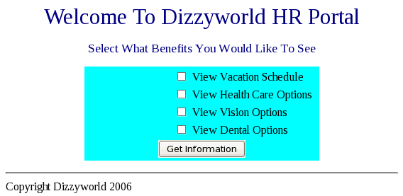 Verify the new context root of the application. In a web browser enter the host and port for the dizzy1 managed server, followed by /hr.