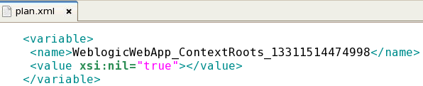 A deployment plan is an XML document used to define an application’s deployment configuration for a specific WebLogic Server environment, such as development, test, or production. A deployment plan resides outside of an application’s archive file and contains deployment properties that override an application’s existing Java Enterprise Edition and WebLogic Server deployment descriptors. Use deployment plans to easily change an application’s WebLogic Server configuration for a specific environment, without modifying existing deployment descriptors.