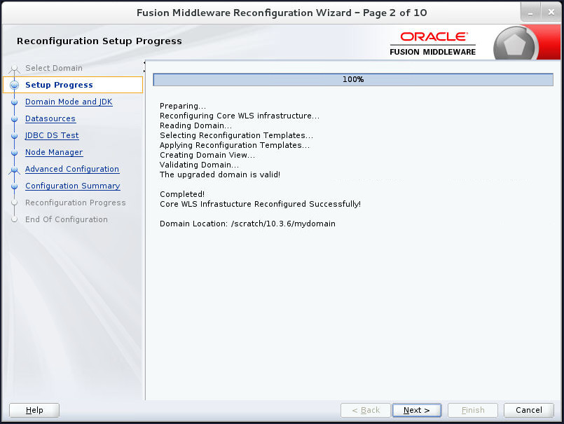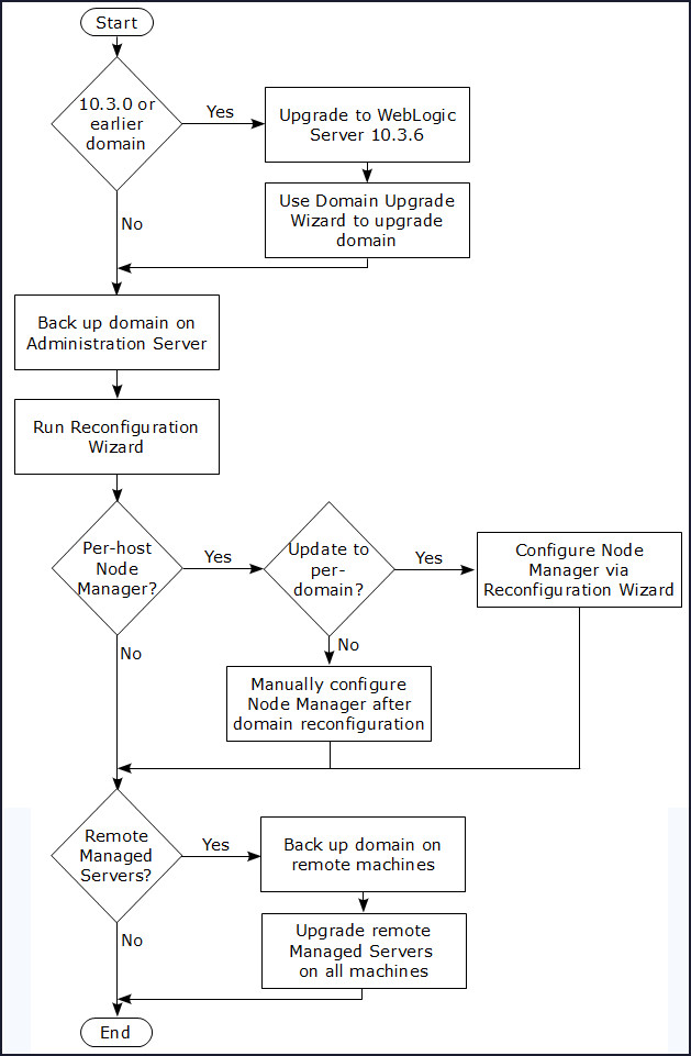 - Reconfiguration templates for all installed Oracle products are automatically selected and applied to the domain. These templates define any reconfiguration tasks that are required to make the WebLogic domain compatible with the current WebLogic Server version.