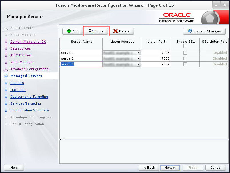 To clone a server, click in the row for the server you want to clone, and then click Clone. The default name for the new clone is original_server_name_clonen, where n starts at 1 and increments for each new server that you clone from that server. When you create a Managed Server that is a clone of an existing Managed Server, all applications and libraries that are targeted to the source server are also deployed to the clone. The cloned server is also assigned to all server groups to which the source server is assigned (if any).
