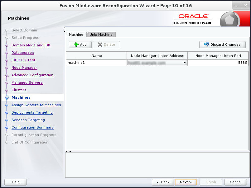 - Migrate Existing Configuration: The existing per host node manager configuration will be migrated to a per domain configuration for the reconfigured domain. This does not include environment specific settings for listen address, listen port, start script name, java home and log file. You will need to set those manually after the domain has been successfully reconfigured.