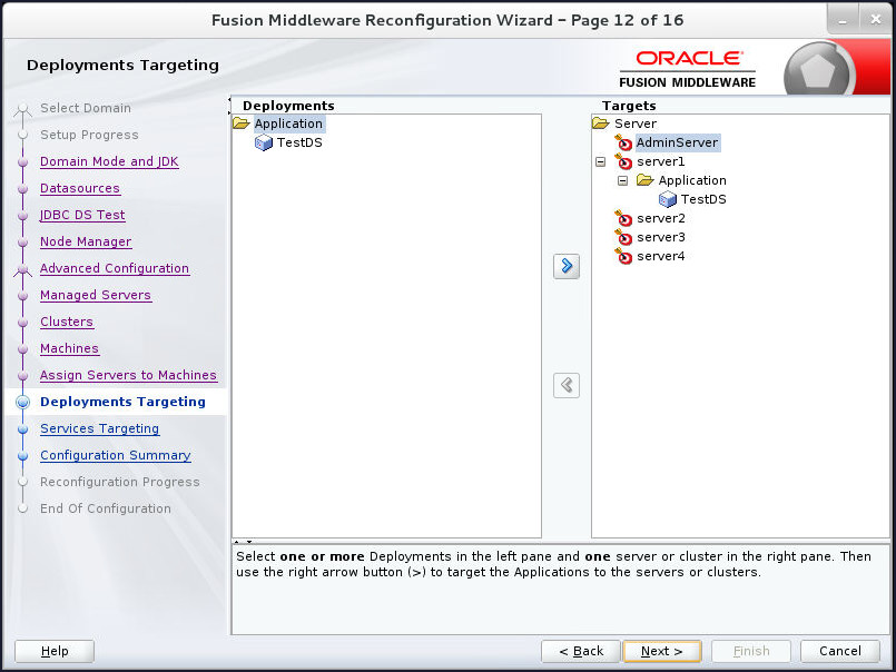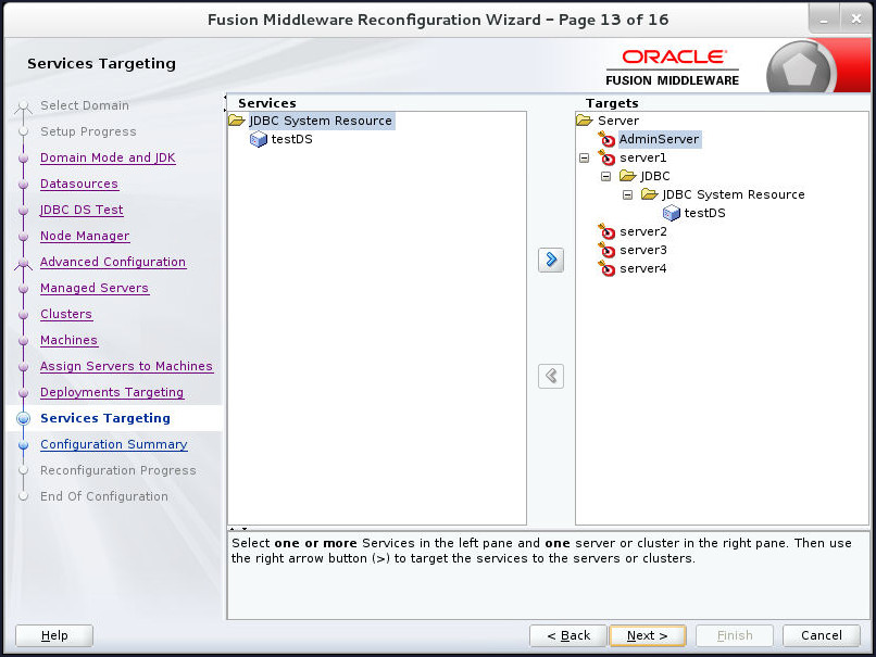 In this tutorial, the service testDS has been targeted automatically to Managed Server server1. Hence, click Next to continue.