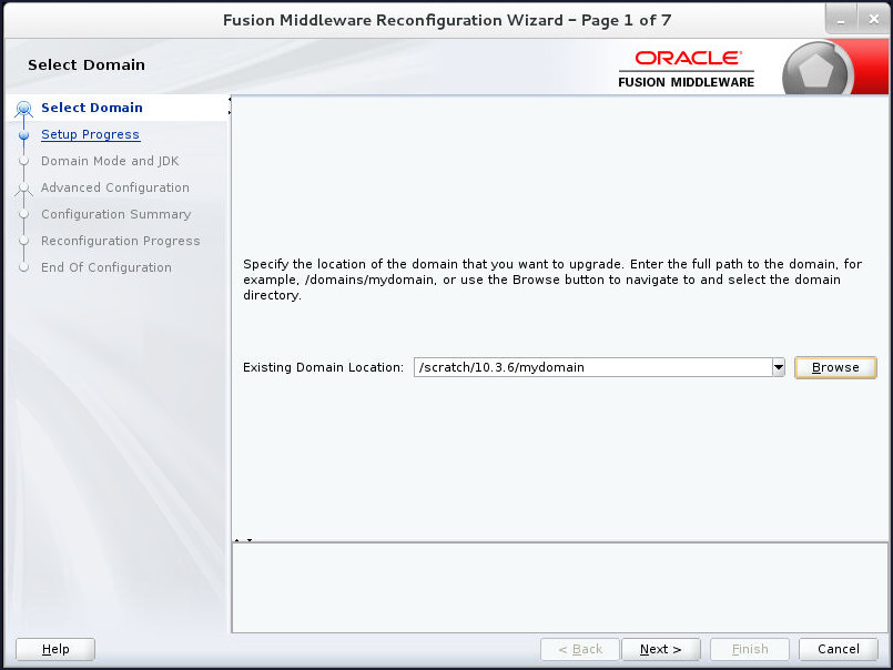 On the Domain Mode and JDK screen, the mode comes from the existing domain and it cannot be changed by the wizard. The JDK which was used when you installed the new version of Weblogic Server is automatically selected as the JDK for the reconfigured domain. You can also click Browse to navigate to the JDK you want to use.