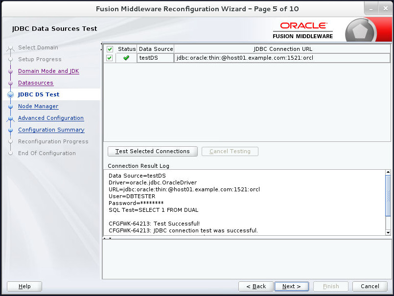 On the JDBC Data Sources Test screen, select the check box for the data source you want to test, and then click Test Connections.