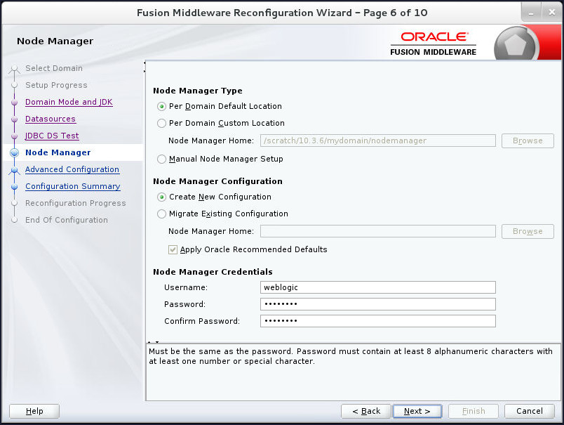 - Create New Configuration: A per domain Node Manager Configuration will be created for the reconfigured domain by using the default settings in nodemanager.properties . You can modify this file after the domain has been successfully reconfigured.