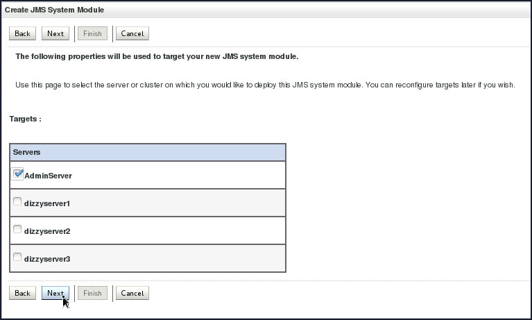 Click AdminServer to choose your current WLS instance as the target for this module and click Next.