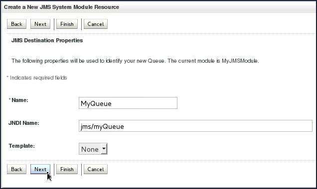Enter MyQueue as the Name for your queue and jms/myQueue as the JNDI Name for the lookup. Click Next.