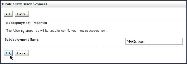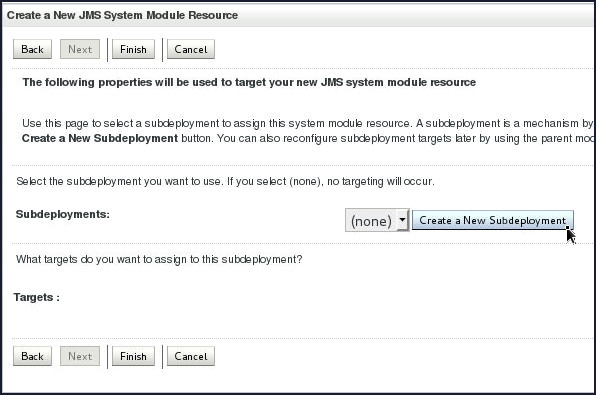 On the next screen, click on Create a New SubDeployment to create a subdeployment for the system module. A subdeployment is the mechanism by which targetable JMS module resources (such as queues, topics, and connection factories) are grouped and targeted to a server resource (such as JMS servers, server instances, or a cluster).