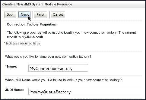 Enter jms/myQueueFactory as the JNDI name for the factory, accept the other options, and click Next.