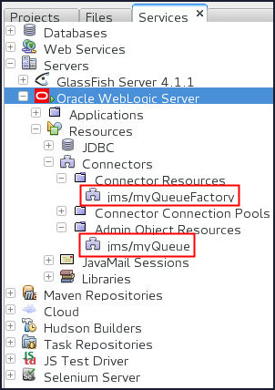 Open NetBeans and click on the Services tab. Expand Resources, expand the Connector Resources and expand the Admin Object Resources folders.