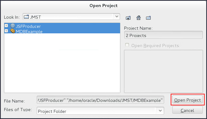 Navigate to the directory where you unzipped files.zip. Select both the JSFProducer and MDBExample projects and click Open Project.