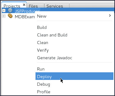 Right-click on the JSFProducer project to deploy the application to Oracle WebLogic Server. Repeat this step to deploy MDBExample to Oracle WebLogic Server.