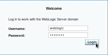 Login to the administration console with the administrative user name and password you used to create your domain. The administrative user's credentials for my domain are weblogic and Welcome1.