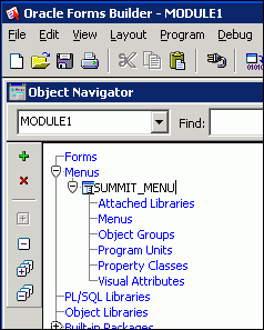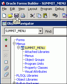Compile the menu. To do this from within Forms Builder, select the SUMMIT_MENU node (or any of its subnodes) in the Object Navigator, and then perform one of the following actions: