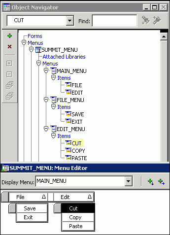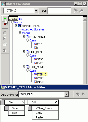 Note that creating menu items under the File object creates a FILE_MENU object as a menu with two items under it. Also, when you relabel the items in the Menu Editor, the names of the items, as shown in the Object Navigator, also change. |