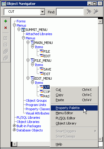 Open the Menu Editor for the Customers_menu by double-clicking the icon to the left of the CUSTOMERS_MENU node in the Object Navigator..