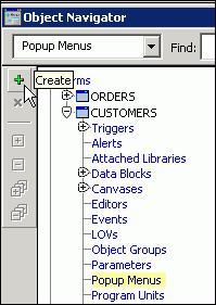 To work around the fact that the provided menu file contains obsolete built-ins, add two menu procedures by selecting the Program Units node in the Object Navigator for the Customers_menu module and then clicking Create. Name the procedures DISABLE_ITEM and ENABLE_ITEM, with the following code: PROCEDURE disable_item (menu_name VARCHAR2, menu_item VARCHAR2) IS PROCEDURE enable_item (menu_name VARCHAR2, menu_item VARCHAR2) IS |