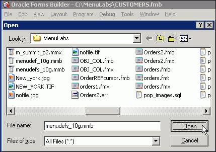To attach the menu to a form, you must modify a property in the form. To do so, first load the form into Forms Builder. Click Open or select File > Open from the Forms menu. Open orders.fmb from the directory where you saved the setup files.