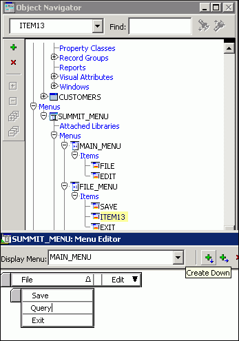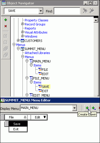 Invoke the Menu Editor by double-clicking the icon to the left of the SUMMIT_MENU node, and then select the Save node in the Menu Editor and click Create Down.