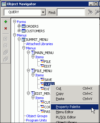 Invoke the Property Palette for the Query item by double-clicking its node in the Menu Editor, or by right-clicking its node in the Object Navigator and selecting Property Palette .