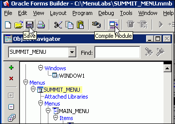 Save and compile the menu by selecting the SUMMIT_MENU node or any of its subnodes in the Object Navigator, and then clicking Save and then Compile Module.