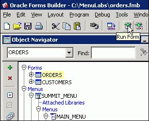 In Oracle Forms Builder, open the Orders and Customers forms and the Summit_Menu menu.