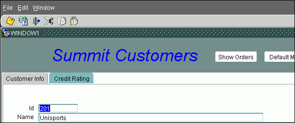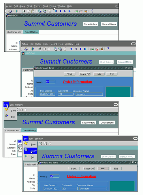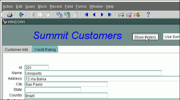 The Customers form uses a menu that is similar to the Forms default menu except that it has the Forms menu item added, with a menu item that enables users to display the orders for a customer. Some users would prefer to have the limited set of options that are defined in the Summit_menu menu, so you decide to provide a button that switches the Customers form to that menu. Additionally, when the Orders form is called from the Customers form, you want its menu to be the same as whatever is being used by the Customers form.