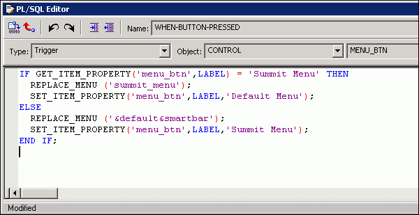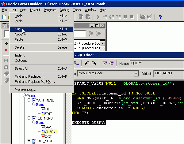In PL/SQL Editor of the File_Menu.Query item of the Summit_Menu menu, select all the code and Cut it.
