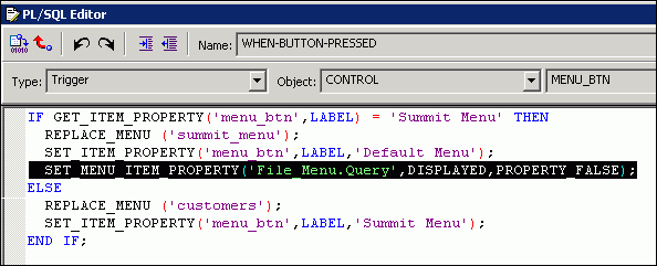 | 1. | Modify the When-Button-Pressed trigger for the Control.Menu_Btn button in the Customers form by adding the following line of code just before the ELSE statement: