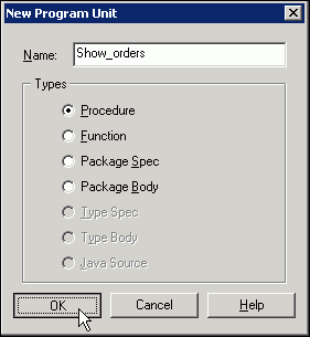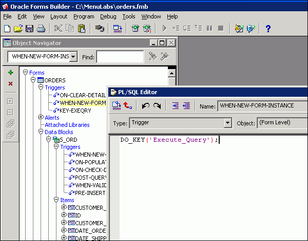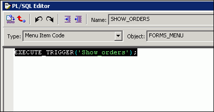 In the Object Navigator, expand the ORDERS and TRIGGERS nodes, and then double-click the icon to the left of the WHEN-NEW-FORM-INSTANCE node to invoke the PL/SQL editor for the trigger.