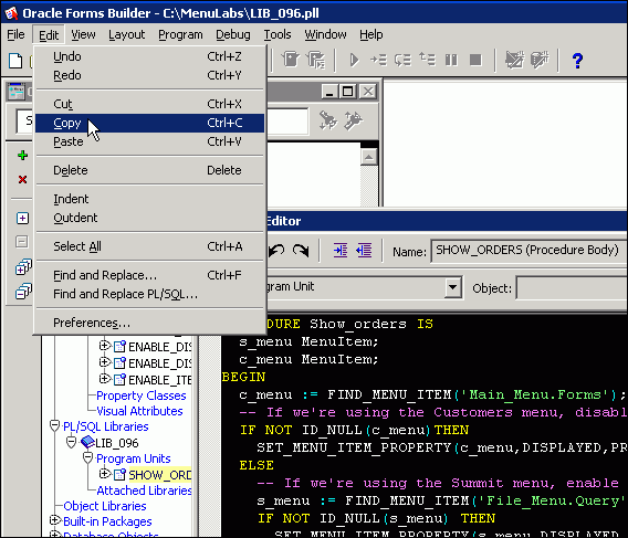 | 10. | Modify the code in the Forms_menu.Show_Orders menu item of the Customers_Menu menu to simply call the SHOW_ORDERS procedure from the attached library: