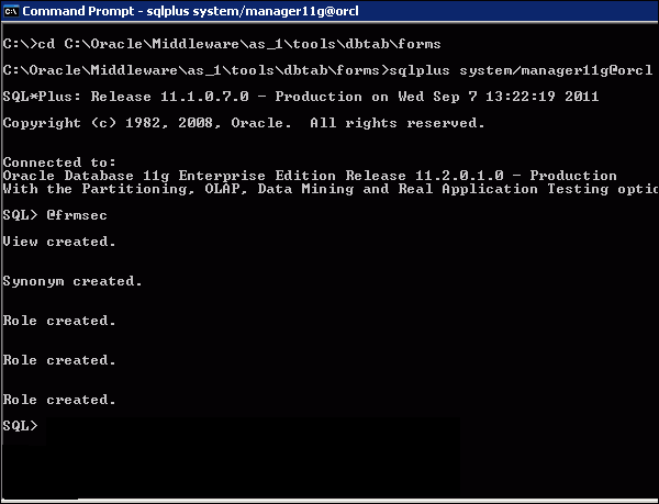 The DBA can create this view by running the script frmXXsec.sql, where XX is the Forms version number. For 10.1.2 and above the script name omits the version number, so it is frmsec.sql. This script is located in a subdirectory of ORACLE_HOME. For example, for 11g this script is located in the following directory: <ORACLE_HOME>\tools\dbtab\forms.