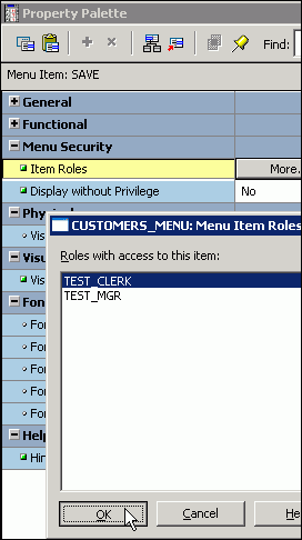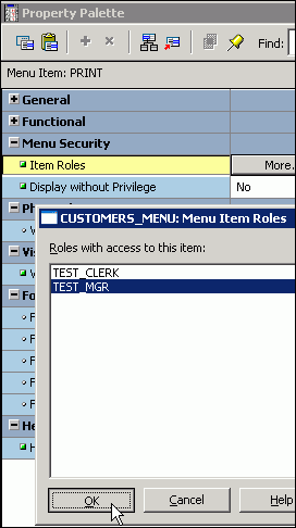 In the Property Palette for the Customers_Menu menu, set Use Security to Yes, and then click More in the Module Roles property to add the roles TEST_CLERK and TEST_MGR in the Menu Module Roles dialog box, typing over the default CLERK and MANAGER roles that were previously defined.