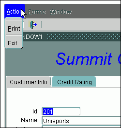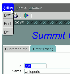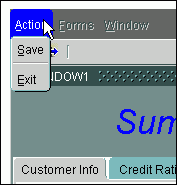 | 5. | Save and compile the menu, and then run the Customers form. Because the SUMMIT user has been granted only the TEST_CLERK role, you should see only the Action > Save and Action > Exit menu choices.