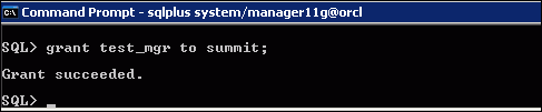 | 6. | The user has been promoted from clerk to manager. In the SQL*Plus window, grant the TEST_MGR role to the SUMMIT user: grant test_mgr to summit; |