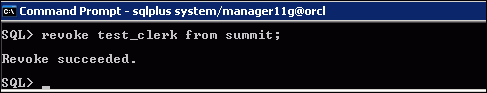 | 8. | In the SQL*Plus window, revoke the TEST_CLERK role from the SUMMIT user: