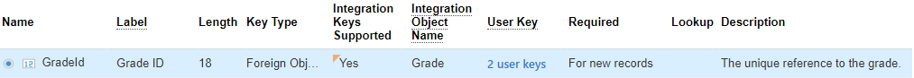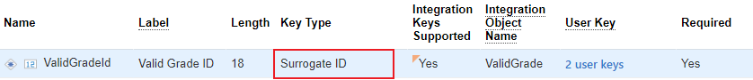 Tip: The Required column value of For new records indicates that either the surrogate ID, or an integration key, or one of the user keys must be supplied when creating valid grades.