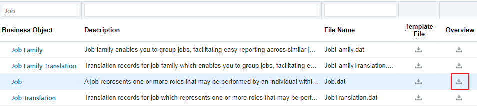 On the View Business Objects page, select the business object of interest and click the file download icon in the Overview column.
