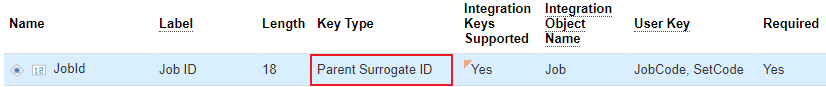 Tip: The Required column value of Yes indicates that either the surrogate ID of the parent job, or an integration key, or the user key must be supplied.