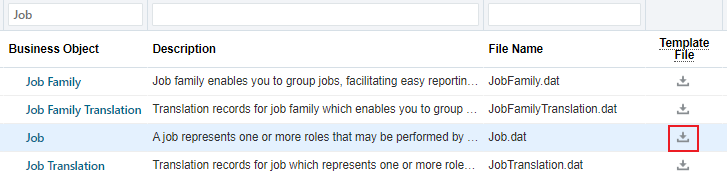 On the View Business Objects page, select the business object of interest and click the file download icon in the Template File column.
