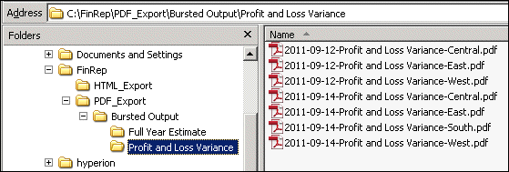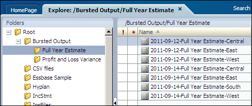 After the batch completes successfully, check the batch output. When you scheduled the batch, you specified snapshot reports in the Bursted Output folder as one of the batch output destinations. In Workspace, select the Bursted Output folder, and verify that snapshot reports were created. Batch Scheduler created two folders below the Bursted Output folder. One folder, Full Year Estimate, contains the Full Year Estimate snapshot reports for each market, Central, East, West, and South. The report names include the date.