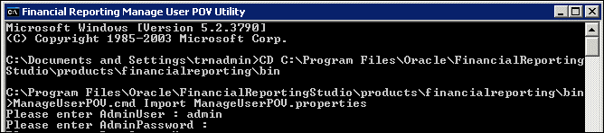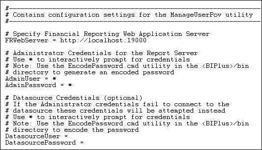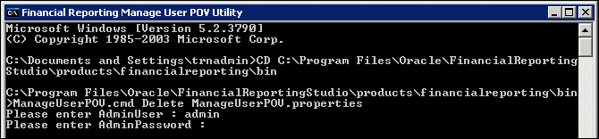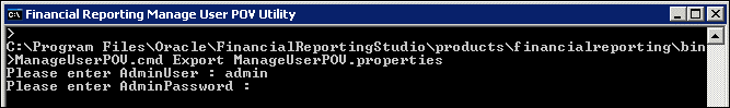 Edit the Program Files\Oracle\FinancialReportingStudio\products\financialreporting\bin\ ManageUserPOV.properties file. a. Enter the Financial Reporting Web application server name, administrator user name, administrator password, and, if needed, the data source user name and password.