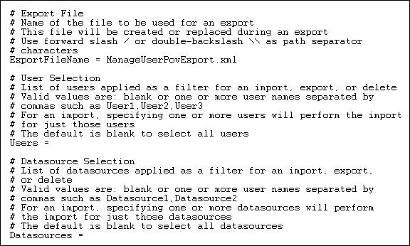 In this example, you use the * to prompt for the administrator user name and password. b. Enter the export XML file name, and the list of users and data sources for which you want to export the user POVs. Leave the list of users and data sources blank to export all user POVs for all data sources.
