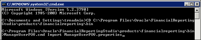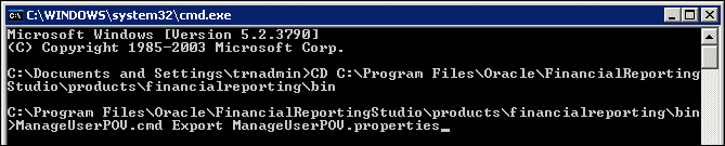 In the Command Prompt window, enter the CD command to change the directory to the Program Files\Oracle\FinancialReportingStudio\products\financialreporting\bin directory.