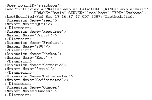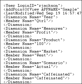 The POVs for the selected user names and data sources are exported to the XML file, ManageUserPOVExport.xml, that you specified in the properties file, ManageUserPOV.properties. This is a portion of an exported XML file: