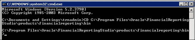 In the Command Prompt window, enter the CD command to change the directory to the Program Files\Oracle\FinancialReportingStudio\products\financialreportin\bin directory.