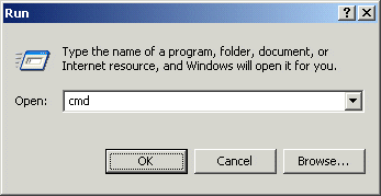 From the Windows desktop, select Start, and then Run. In the Open box, type cmd, and click OK.