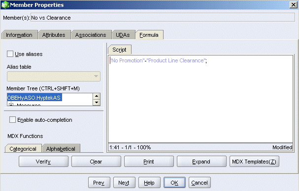 Replace the calculation script formula "No Promotion"-"Product Line Clearance"; with the MDX formula [No Promotion] - [Product Line Clearance].