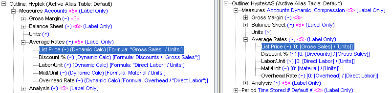 A side-by-side comparison of the Hyptek BSO and ASO outlines provides examples of the differences in syntax for formulas in the Average Rates members.