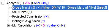 Double-click Gross Margin %, then edit member properties to replace the formula "Gross Margin" / "Net Sales"; with [Gross Margin] / [Net Sales].